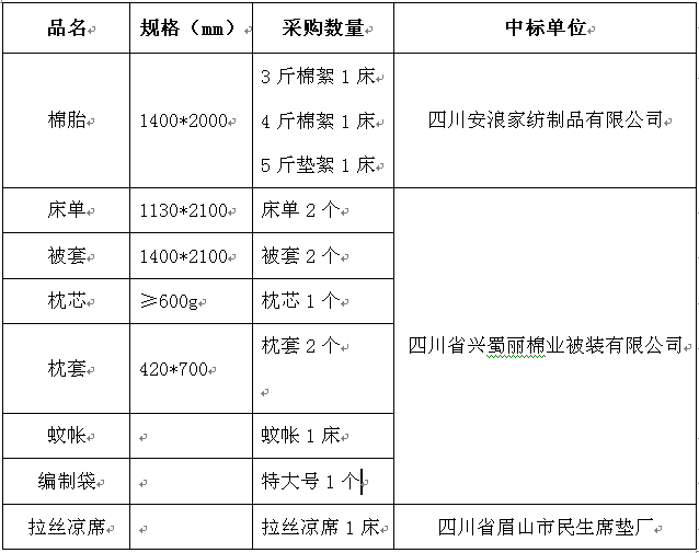 根据四川省纤维检验局提供的质量标准和《万象城罗马体育西甲联赛awcg学生公寓床上用品招标公告》的要求,万象城官网招标小组于2015年6月18日对投标单位提供样品的质量和价格进行综合比选评标,拟确定2015年学生公寓床上用品的中标单位如下: