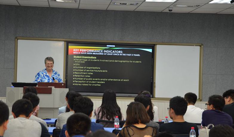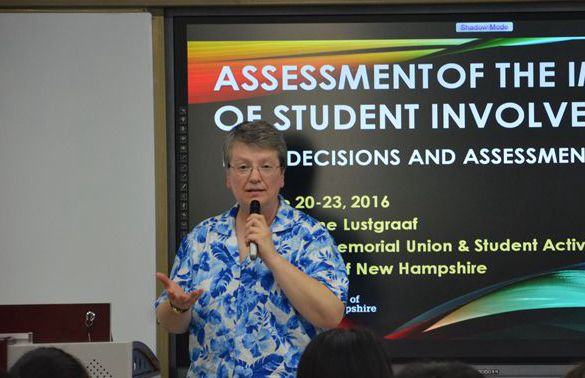【本网讯】6月23日下午,美国新罕布什尔大学教授系列讲座之“Assessment of the Impact of Student Involvement ”在航空港校区1402教室举行,讲座主讲人为美国新罕布什尔大学学生事务处处长Mary Anne Lustgraaf,万象城官网部分负责学生事务的老师和各学院学生会干部共50余人参加了此次讲座。本次讲座由学校国际交流与合作处和教师教学发展与评估中心协调组织,并得到了相关学院师生的支持。