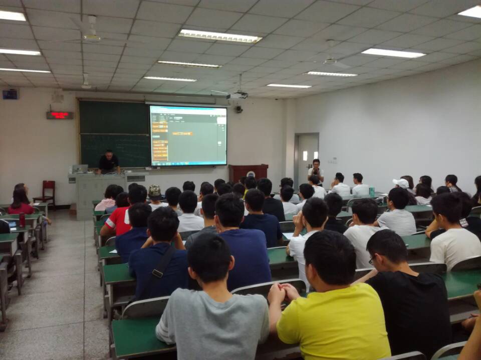 Dan Garcia通过列举一个简单的程序,向师生们介绍了一项计算思想——The Beauty and Joy of Computing (BJC),通过Scratch实现友好的编程,此项计算机语言相对于其他计算机语言更加简洁、更贴近自然语言。随后Dan Garcia向大家做了简短的演示,通过图形程序语句的简单拼合以及参数的输入就能完成程序编写,展示出了此项计算机语言的优越性——美丽而富有乐趣。