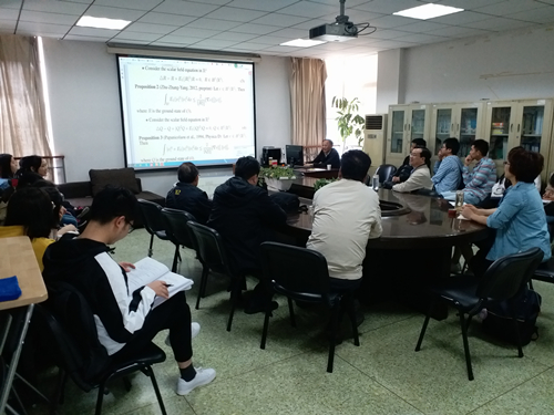 【本网讯】4月24日下午,四川大学二级教授、博士生导师张伟年,日本学术振兴会特别研究员、电子科技大学资深教授、博士生导师张健,电子科技大学资深教授、博士生导师钟守铭应应用数学学院邀请,在行政楼421会议室分别作题为《Invariant Manifolds with/without Spectral Gap》、《戴维-斯图尔森系统孤立子的动力学特征》和《忆阻器神经网络系统的稳定性分析》的学术讲座。应用数学学院师生积极参加了本次学术讲座,讲座由应用数学学院院长周钰谦主持。