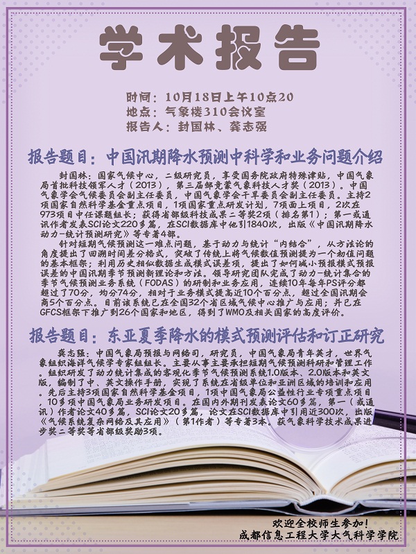 【学术预告】中国汛期降水预测中科学和业务问题介绍、东亚夏季降水的模式预测评估和订正研究