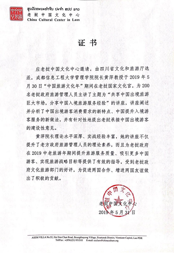 【本网讯】应老挝中国文化中心邀请,由四川省文化和旅游厅选派,万象城官网管理学院院长黄萍教授与四川旅游规划设计研究院设计所顾相刚所长作为四川旅游业界的专家代表,于5月30日在老挝举办的“中国旅游文化周”期间,为200名老挝政府旅游管理和从业人员做了旅游文化产业发展的专题讲座。黄萍讲授的题目是“共享中国出境旅游消费大市场,分享中国入境旅游管理好经验”。