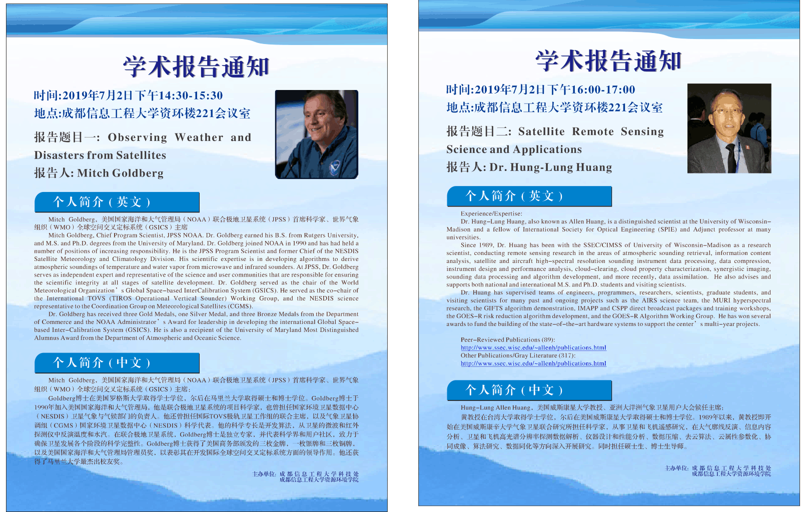 【学术预告】美国国家海洋和大气管理局Mitch Goldberg教授、美国威斯康星大学教授Hung-Lung Huang来校作学术讲座