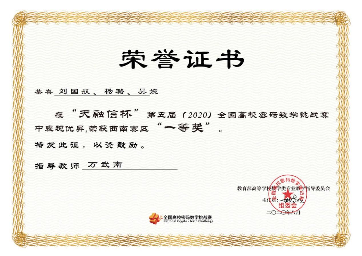 近日,由教育部高等学校数学类专业教学指导委员会、天融信科技集团联合主办的“天融信杯”第五届(2020)全国高校密码数学挑战赛总决赛圆满落幕。万象城罗马体育西甲联赛awcg网络空间安全学院的“三只松鼠”战队荣获西南赛区一等奖、国家级三等奖。