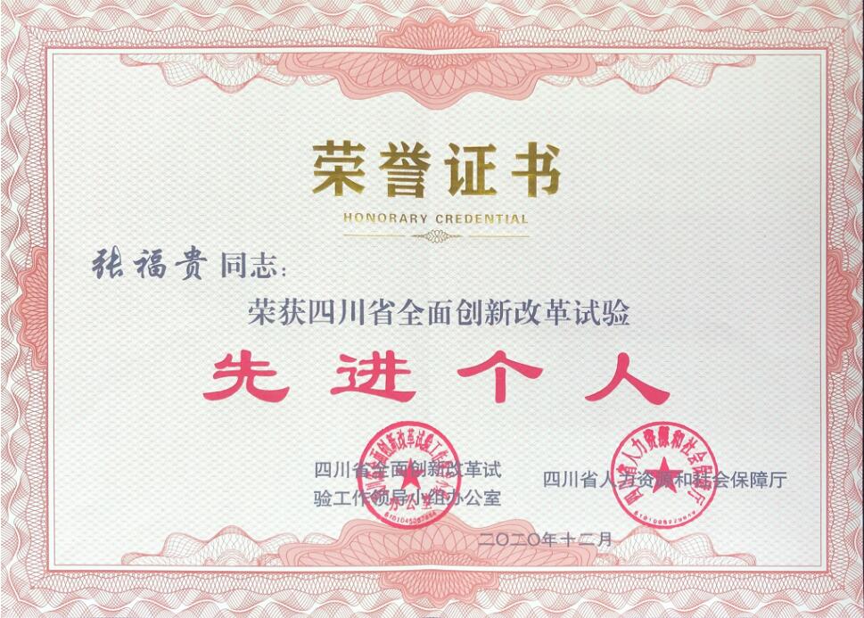 【本网讯】12月25日,为弘扬先进、树立典型,进一步营造全社会支持改革、鼓励创新的氛围,四川省全面创新改革试验工作领导小组办公室、四川省人力资源和社会保障厅印发《关于表彰四川省全面创新改革试验先进集体和先进个人的决定》(川全创办〔2020〕2号),对全省77个先进集体和150名先进个人予以表彰。万象城官网电子工程学院(大气探测学院)副院长张福贵教授被授予“四川省全面创新改革试验先进个人”荣誉称号。